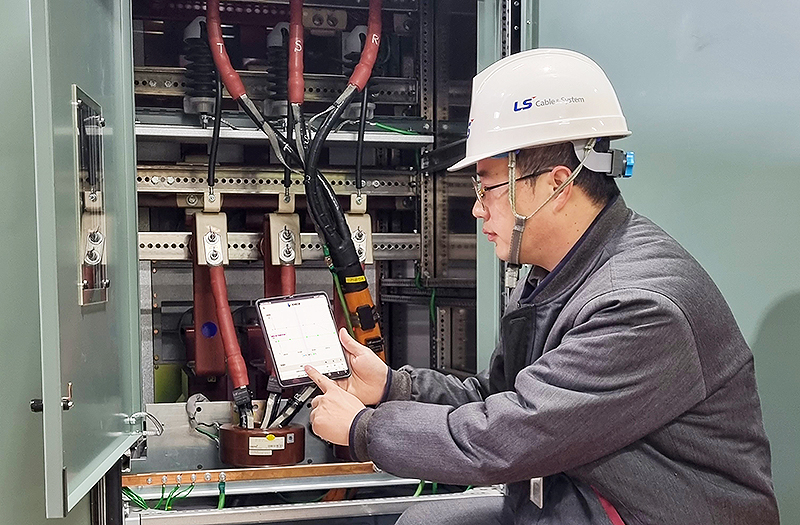Photograph) An LS C&S worker monitoring the status of power distribution cables through the i-check system application installed on a mobile device.
