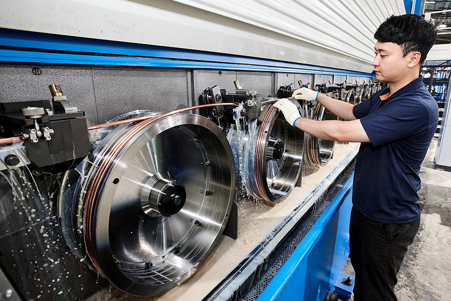 Photograph) An employee is working with copper conductor production equipment at LS Cable & System Gyeongbuk Gumi Factory.