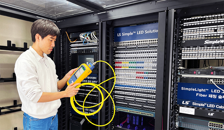 Photograph) An employee of LS Cable & System inspecting the PoE cable at the data center.
