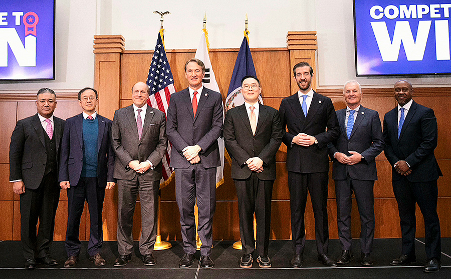 Photograph) On December 12 (local time), attendees pose for a commemorative photo at the announcement of the rare earth magnet plant investment in Chesapeake, Virginia. Pictured from third from left are U.S. Deputy Secretary of Commerce Paul Dabbar; Governor of Virginia Glenn Youngkin; and CEO of LS Cable & System Koo Bon-kyu.